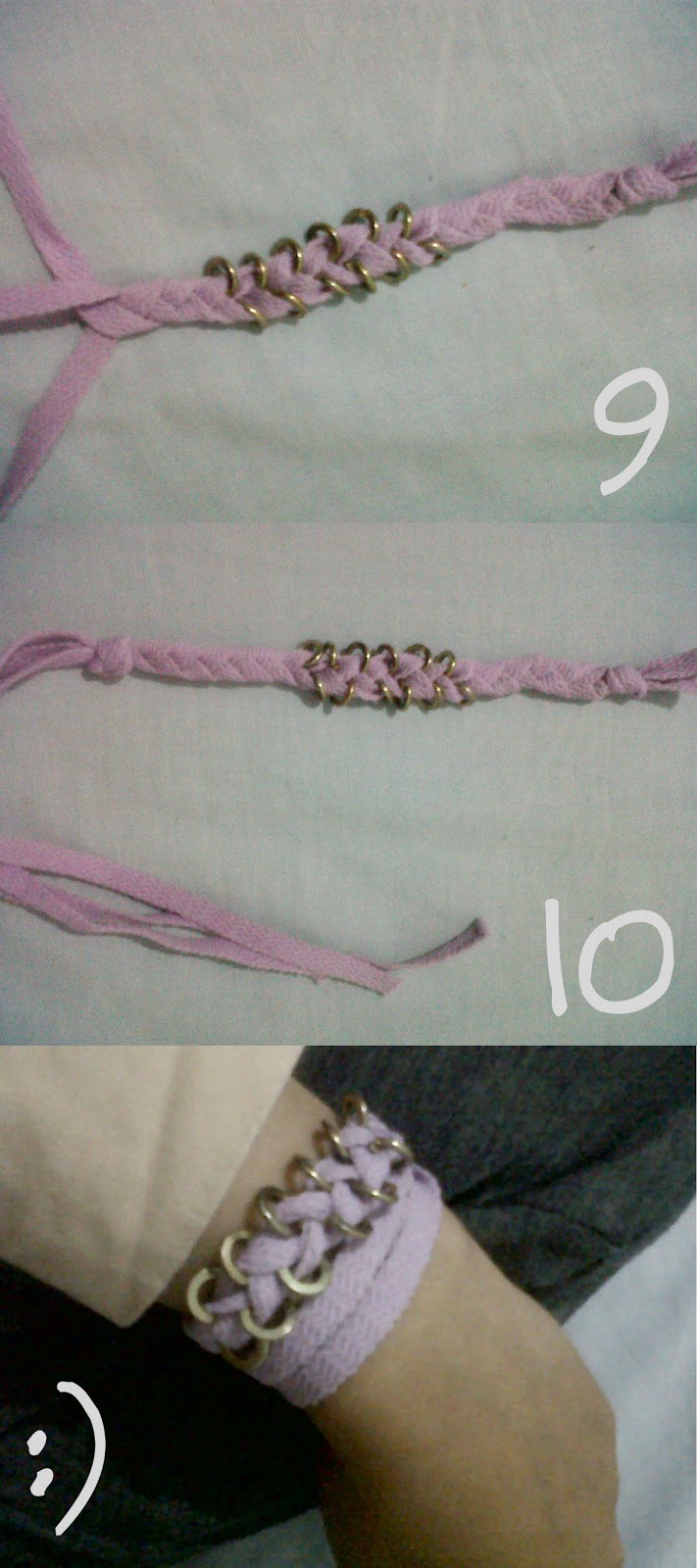 5. Letakkan tali bagian pinggir yang sudah dikasih cincin penutup ke bagian tengah (di langkah ini sampai ke-8, kehati-hatian dan kesabaran diperlukan!)